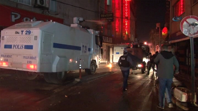 Okmeydanı Şark Kahvesi’nde yüzleri maskeli bir grup izinsiz gösteri yapmak istedi. Çöp konteynırlarını yola devirerek barikat kuran grup polisin dağılın uyarılana molotof kokteyleri, havai fişekler ve taşlarla karşılık verdi.