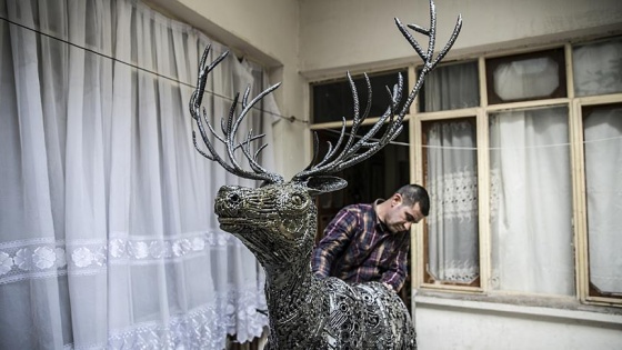 Akrabalarının kullanmadığı çatalları da toplayan Altınorak, 2 metre uzunluğunda geyik heykeli yaptı.