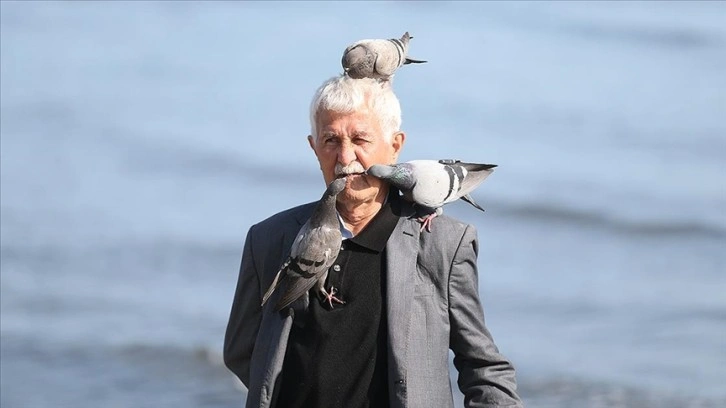 Akyazı Mahallesi sahilinde yürüyüş sırasında gördüğü güvercinleri önceleri izleyen iki çocuk babası Çolak, daha sonra da bu hayvanları beslemeye başladı.