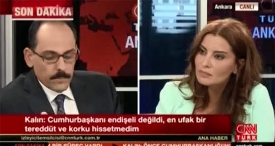 Kalın, MİT’in Cumhurbaşkanı Erdoğan’a haber verip vermediği konusuyla ilgili soruya, "Genelkurmay kendi sürecini analiz edip raporluyor. Bugün de bir açıklamaları oldu zaten detaylı. O süreçte de zaten MİT’in istihbaratı söz konusu. MİT Cumhurbaşkanımız’a bir bilgi arz ederken bunun temelli, altının dolu olması lazım. MİT’le Genelkurmay çalışma yaparken, bunlar deşifre olduklarını anlıyorlar ve darbeyi erkene alıyorlar" cevabını verdi. Kalın, "O gece insanın aklına gelebilecek en son şeylerden birisini yaşadık. Tablo netleşmeye başlayınca Sayın Cumhurbaşkanımız’la görüştük talimatlarını istedik. O da halkın sokağa çağrılmasını istedi" dedi.