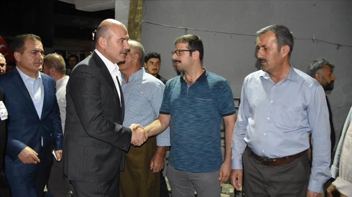 Köy camisinin önündeki taziyede ailelere başsağlığı diledikten sonra ilçe merkezine geçen Soylu, vatandaşlar tarafından "Şehitler ölmez, vatan bölünmez", "Kahrolsun PKK" ve "Dik dur, eğilme, Üzümkıran sizinle" sloganlarıyla karşılandı.
