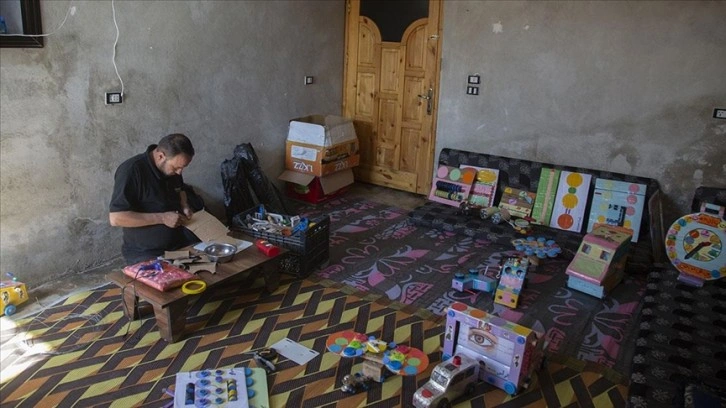 Evinin odalarından birini çalışma atölyesine çeviren 4 çocuk babası Arnus, topladığı atıkları temizleyip renklendirip ve süsleyerek eğitim materyallerine dönüştürüyor.
