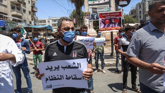 İdlib’de siviller, Kovid-19 tedbirleri kapsamında sosyal mesafeye uyarak Rusya’nın BM yardımlarını engellemesine karşı çıkmak amacıyla bir araya geldi.