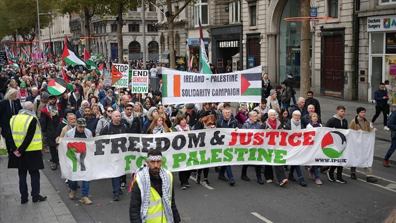 İrlanda Filistin Dayanışma Derneği tarafından organize edilen yürüyüş, Dublin'deki Garden of Remembrance Parkı'ndan başladı, Parlamento önünde sona erdi.