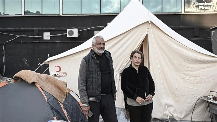 Hatay'ın İskenderun ilçesinde, Kahramanmaraş merkezli depremlerin ardından yapılan incelemede az hasarlı olduğu öngörülen evlerine yaşadıkları travma nedeniyle 15 gündür giremeyen çift, binanın karşısındaki arsada kurdukları çadırda barınıyor.