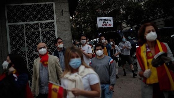 İspanyol bayrakları taşıyan gruplar, hükümetin belirlediği kademeli normalleşme sürecini, olağanüstü halin devam etmesini ve Kovid-19'dan etkilenen ülke ekonomisiyle ilgili alınan önlemleri eleştiriyor.