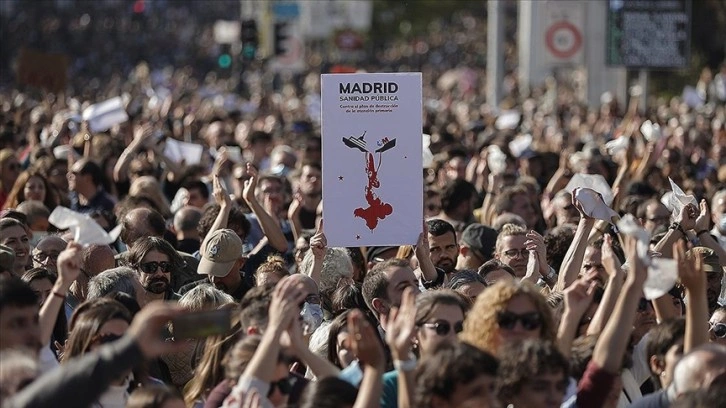 En az 6 ay sonraya randevu alabildiklerini, hastanelerde doktor bulamadıklarını söyleyerek sağlık sektörü çalışanlarının gösterisine destek veren Madridliler de "Sağlığımız savunulur, satılmaz", "Kamusal sağlık hizmeti" sloganları attı.