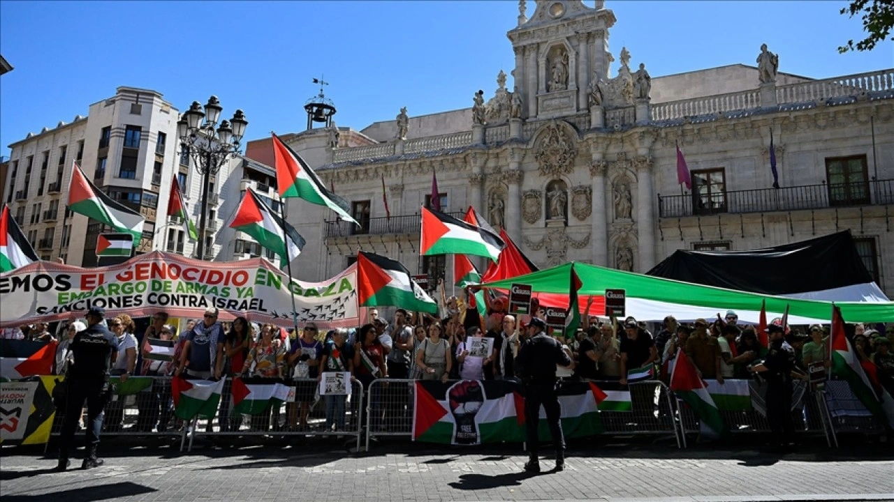 Belirli noktalarda gösterilerini yoğunlaştıran İspanyollar, Filistin bayrakları sallayarak, "Soykırımı durdurun", "Katil Netanyahu", "Bu bir savaş değil, soykırım", "Filistin'e özgürlük" sloganları attı.