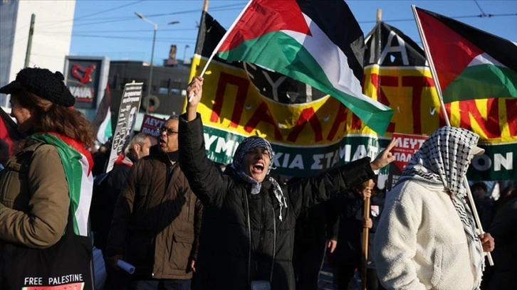 Atina'daki Eleftheria (Özgürlük) Parkı'nda bir araya gelen eylemciler, İsrail'in Atina Büyükelçiliğine doğru yürüyüşe geçti.