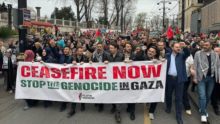 "Filistin İnisiyatifi"nin çağrısıyla ellerinde Filistin bayraklarıyla Sultanahmet Meydanı'nda toplanan protestocular, İsrail aleyhine slogan atarak Eminönü Meydanı'na yürüdü.