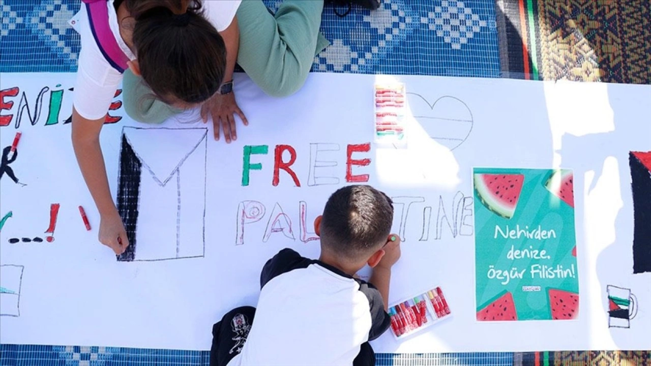 Etkinlik kapsamında minik çocuklar, yere serilen uzun bir tuvale Gazze'ye destek mesajları içeren resimler çizdi.