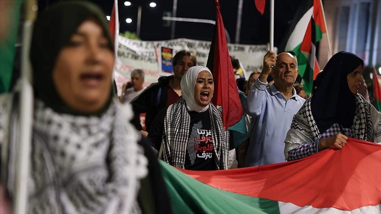 Atina'daki Eleftheria Meydanı'nda bir araya gelen katılımcılar, "Filistin'e özgürlük" sloganlarıyla önce ABD'nin Atina Büyükelçiliğine ardından da İsrail'in Atina Büyükelçiliğine yürüdü.