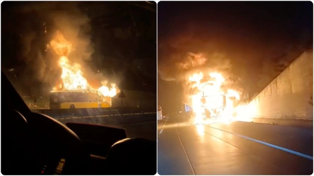 Öte yandan, yangın anı cep telefonu kamerasıyla kaydedildi. Görüntülerde, otobüsün arka kısmının alevli şekilde yandığı görülüyor.