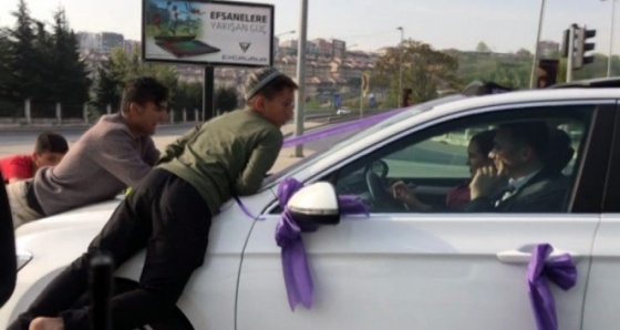 Kağıthane'de kırmızı ışıkta duran gelin arabasının önünü kesen çocuklar adeta terör estirdi. Bahşiş alabilmek için aracın üstüne çıkan çocuklardan biri aracın önüne eğilerek gitmesini engelledi. Damadın yaşadığı korku dolu o anlar kameralara yansıdı.
