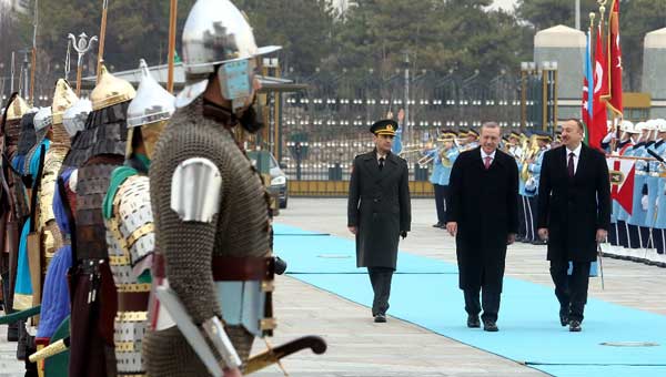 16 Türk devletinin kıyafeti ile bayrağını taşıyan Askerler, tören birliğinin karşısında, Muhafız Alayı askerlerinin önünde yer alırken törende, bir ilk daha gerçekleşti. Cumhurbaşkanlığı Muhafız Alayı Bando Birliği, Erdoğan, araçtan inen Aliyev’i karşılarken "Osmanlı Diriliş Marşı”nı çaldı.
