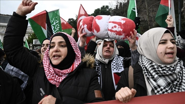 "Gazze'deki ambargo kırılsın", "Refah Sınır Kapısı açılsın" ve "Filistin halkının yanındayız" yazılı pankartlar taşıyan göstericiler, tekbir getirdi, İsrail aleyhine sloganlar attı.