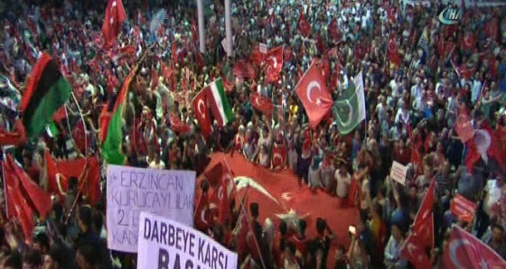 Çalınan marşlara ve şarkılara eşlik eden binlerce kişi ellerindeki Ay yıldızlı Türk Bayrağıyla darbe girişimine tepki gösterdi.