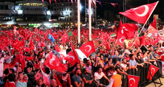 Meydanlarda toplanan binlerce vatandaş, sloganlar atarak, çalınan marşlara ve şarkılara eşlik etti. Ay yıldızlı Türk bayrağını taşıyan vatandaşlar meşaleler yakarak darbe girişimine tepkilerini dile getirdi.