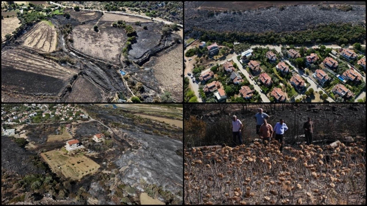 Ormanlık alanın alevler nedeniyle siyaha bürünmesi ve yangında hasar alan tarım arazileri dronla görüntülendi.