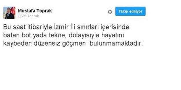 İzmir Valisi Mustafa Toprak, İzmir sınırları içerisinde bot batmadığını, herhangi bir can kaybı olmadığını bildirdi.