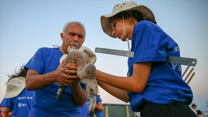 Flamingoların sağ bacağına PVC plastik halka, sol bacağına da metal halka takan yetkililer, yavruların göç yolları, barındıkları alanlar ve yaşam sürelerini daha kolay takip edilebilecek.