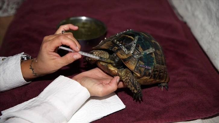 Aydın'ın Efeler ilçesinde bir hayvanseverin yolda ölmek üzereyken bulduğu kaplumbağa veteriner kliniğindeki müdahaleyle hayata döndürüldü, hayvanın kırılan kabuğu metal plaklar kullanılarak bir araya getirildi.