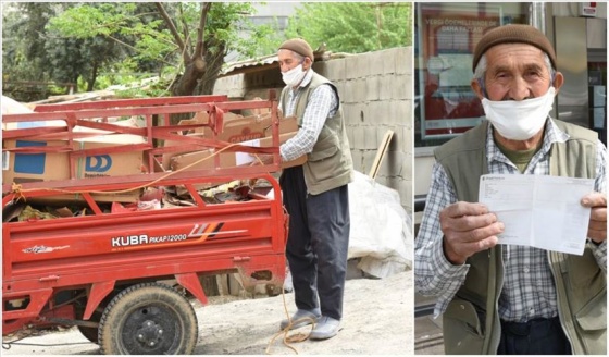 Kahramanmaraş'ın Türkoğlu ilçesinde geçimini kağıt toplayarak sağlayan 64 yaşındaki Hüseyin Gözel, bir haftalık kazancını Milli Dayanışma Kampanyası'na bağışladı.