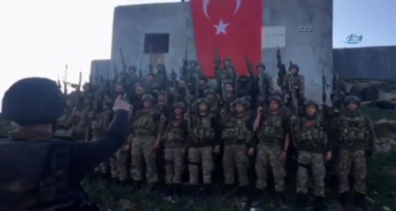Bölgeyi terör örgütünden temizleyen güvenlik güçleri bir evin üzerinden dalgalandırdıkları dev Türk bayrağı eşliğinde Ekrem Şama’nın “Bu Bayrak” şiirini okudu.