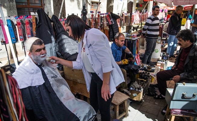 ADANA (AA) - ÖMER FANSA - Merkezde bu iş için görevlendirilen personel, tıraş ve bakım malzemelerini hazırladıktan sonra araca atlayıp ayakkabı boyacısı ve seyyar satıcı gibi mesleklerini kaldırımlarda icra edenlerin yoğun bulunduğu bölgelere gidiyor.