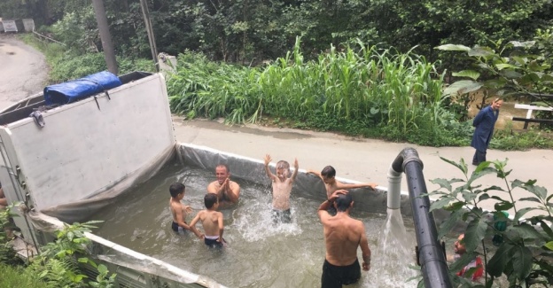 Sıcaktan bunalan Rizeliler kamyonun kasasına su doldurup serinlediler.