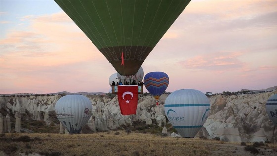 Türkiye'nin önemli turizm merkezlerinden Kapadokya bölgesindeki sıcak hava balonları bu sabahki uçuşlarını, sepetlerine asılan Türk bayraklarıyla gerçekleştirdi.