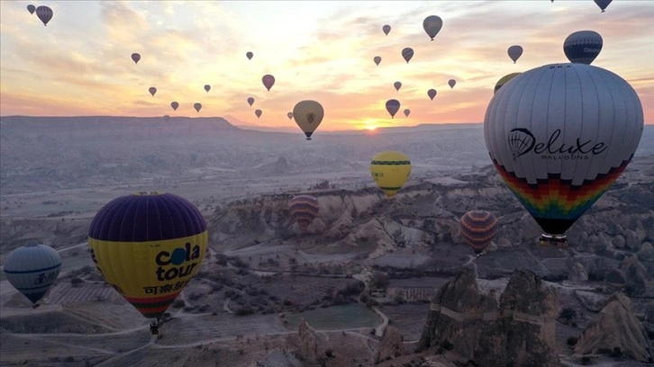 Gün ağarmadan Nevşehir'in Göreme beldesinde ekiplerce hazırlanan sıcak hava balonlarına binen turistler, yeni yılın ilk güneşini Kapadokya semalarında karşıladı.