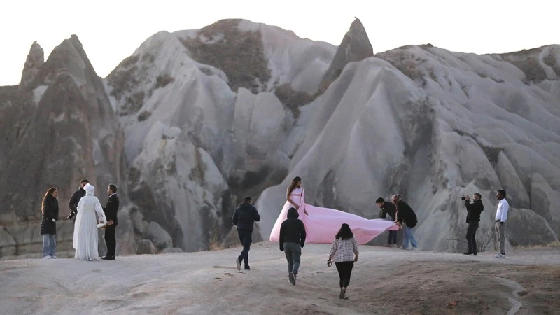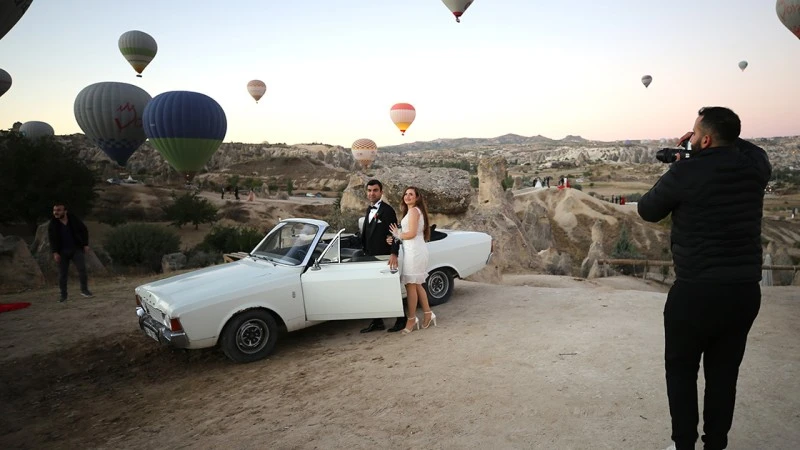 UNESCO Dünya Kültür Miras Listesi'nde yer alan, milyonlarca yıl öncesine uzanan kaya oluşumlarıyla konuklarına masalsı görünüm sunan Kapadokya'da, turistlere yönelik tur aktivitesinde kullanılan sıcak hava balonları, klasik arabalar ve atlara, fotoğraf meraklıları da geliyor.