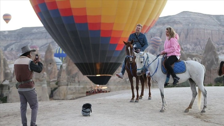 Güneşin yüzünü göstermesiyle peş peşe bölge semalarına yükselen balonların önünde konukların kimisi at sırtında kimisi ise kiraladığı kostümlerle fotoğraf çektiriyor.