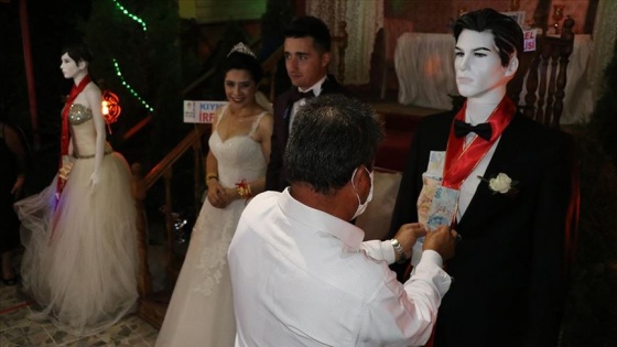 Düğünde sosyal mesafe kuralına uyularak takılar gelinlik ve damatlık giydirilen cansız mankene takıldı.