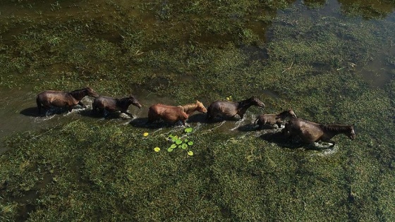 Konar göçer Yörükler tarafından Bursa'nın Karacabey ilçesine getirilip doğaya salındığı bilinen, bir asırdır yaşamlarını Karacabey Longozu'nda yabani olarak sürdüren Orta Asya kökenli atların bölgede doğayla uyumları, birlikte hareket etmeleri dikkati çekiyor.