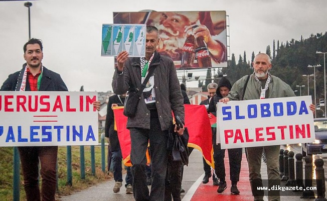 Cuma namazının ardından ABD'nin Podgorica Büyükelçiliği önünde toplanan grup, üzerinde "Kudüs, Filistin'dir", "Filistin'e özgürlük" yazılı dövizler taşıdı.