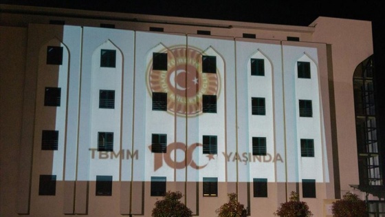 Karadağ İslam Birliği tarafından medrese binasında yansıtılan kutlama mesajında "TBMM 100 yaşında" ifadelerine yer verildi.
