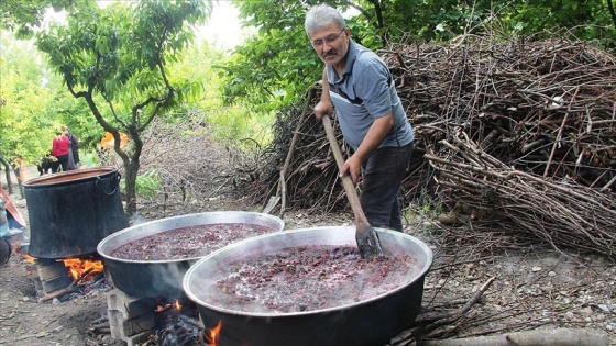 Ağaçlar silkelenerek yere serilen örtülerde toplanan dutlar, yapraklarından arındırılmasının ardından kazanlara konuluyor. Su ilave ettikten sonra odun ateşinde yaklaşık 10 saat kaynatılan dutlar, daha sonra şırasını almak için üç veya dört kez süzme işleminden geçiriliyor.
