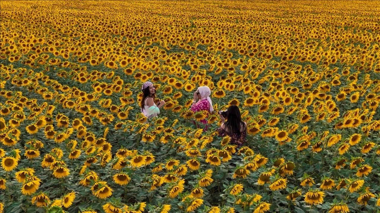 Sarı ve yeşilin tonlarıyla görsel şölen oluşturan ayçiçekleri, özellikle gün doğumu ve gün batımında kartpostallık manzaralar oluşturuyor.