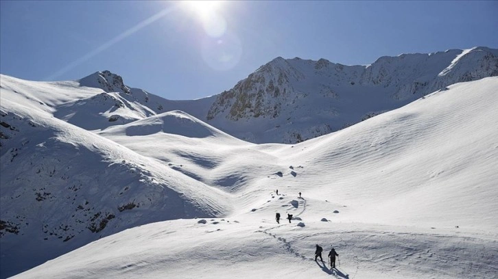 Kar kalınlığının 1 metre olduğu arazide ilerleyen dağcılar, yaklaşık 6,5 saat tırmanış yaptıktan sonra hedefledikleri noktaya ulaşıyor.