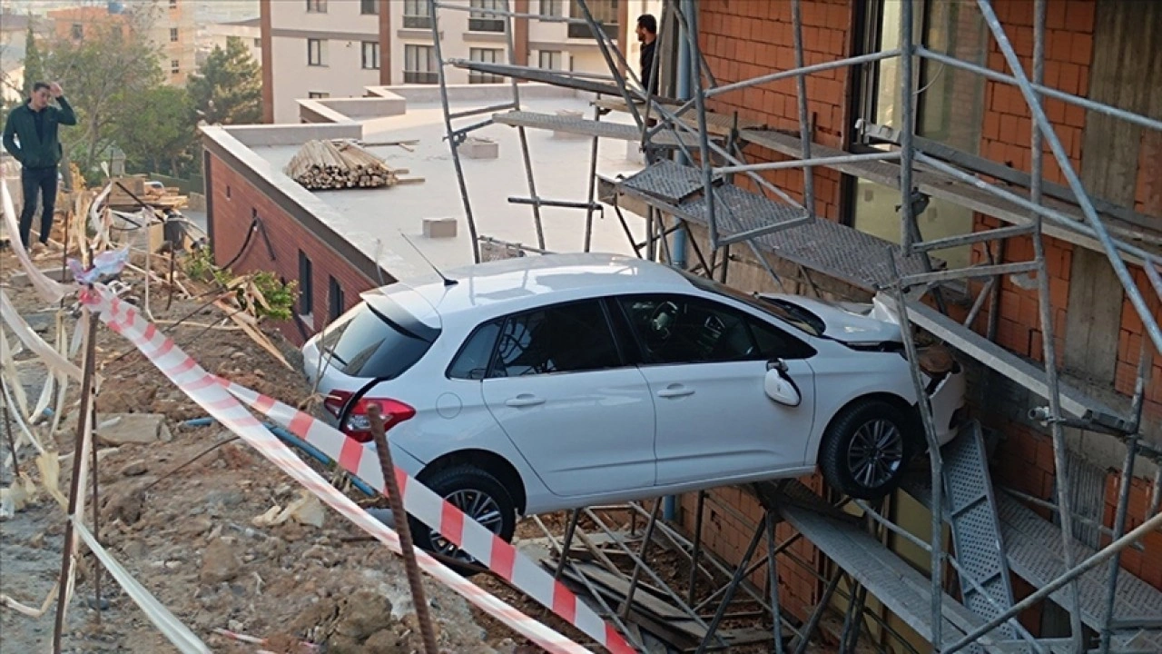 Kartal'da kontrolden çıkan otomobil istinat duvarıyla inşaat arasında asılı kaldı