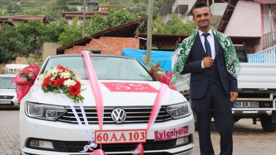 Sabah süslenen gelin arabası, uzun konvoy eşliğinde ilçe merkezinde yaşayan gelini almaya gitti. Aracın arkasındaki "Gazi oldum, böyle vurulmadım" yazısı dikkati çekti.