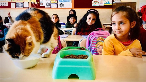 Öğrencilerden Mina Kıran da kediyi çok sevdiğini belirterek, "Sokakta bulduğumuzda hastaydı. Bahçeye getirdik, önce onu besledik. Bahçede ona sıcak bir yuva yaptık. Ne zaman hasta olsa veterinere götürüyoruz. Kedi sınıftayken çok mutlu oluyorum. Birlikte ders dinliyoruz." dedi.