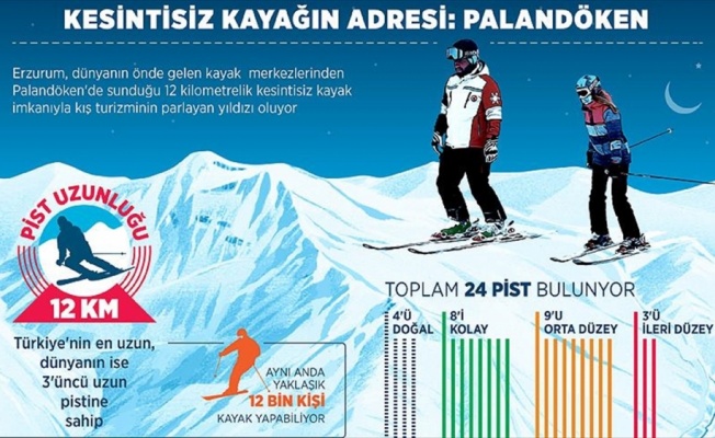 Dünyada "kış turizminin parlayan kenti" olma yolunda ilerleyen Erzurum'da kurulu 12 kilometre pist uzunluğuna sahip Palandöken Kayak Merkezi, misafirlerine gece gündüz kesintisiz kayak yapma imkanı sunuyor.