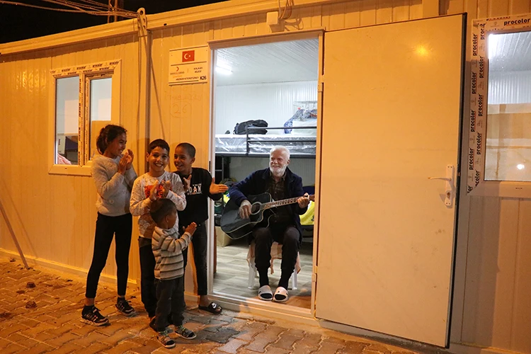 Kahramanmaraş merkezli 6 Şubat depremlerinden etkilenen Hatay'daki konteyner kentte barınan 70 yaşındaki Mehmet İstanbuloğlu, akşamları düzenlediği mini konserlerle depremzedelere moral oluyor
