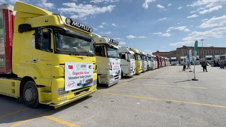 "7 Ekim'den bu tarafa elimizden geldiği kadar kardeşlerimizin ayni ve nakdi yardımlarını Gazze'ye ulaştırmaya çalıştık. Bu konuda lider bir konumdayız. Bu filo organizasyonu ise diğer ülkelerden de erdemli insanların katılımıyla devam edecek. Bu yardımlar tek bir sefere mahsus değil. İnsanın ihtiyaç duyduğu hangi ihtiyaç malzemesi varsa onları ulaştırmaya çalışacağız. Buradan 6 tırı yüksek nitelikli gıda olmak üzere toplam 22 tırı bugün uğurluyoruz. Bunlardan 2 tırı battaniye ve insanları soğuktan koruyacak malzemeleri, 4 tırı çok nitelikli besleyici gıdaları, 16 tır ise çeşitli gıda ve ihtiyaç malzemelerini içermektedir."