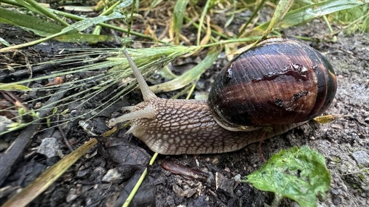 Nemli yerleri seven büyüklü küçüklü çok sayıda salyangoz yapraklarda, yol kenarlarında ve taşlarda gezerken görüntülendi.