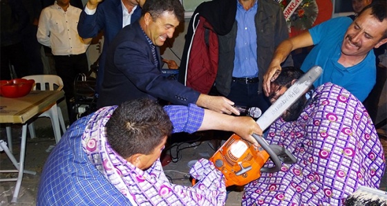 Güner, "Bu şakaların başında motorlu testere ile temsili tıraş etme geleneği yer alıyor. Düğünlere davet edilen köylüler ya da dışarıdan gelen misafirlerin arasından gönüllü olan kişileri düğün eğlencesi esnasında köy meydanında berber ve çırağı tarafından sandalyeye oturtularak yüzlerine ve saçlarına büyük fırçayla ayakkabı boyası sürülüp ayrıca kül ve kum serpiştiriliyor. Daha sonra zinciri sökülmüş ve gaması kilitlenmiş hiçbir tehlikesi bulunmayan motorlu testereyi çalıştırarak biraz gürültülü de olsa temsili tıraş yapılıp müşteri berberin talep ettiği ücreti vermek zorunda. Toplanan tıraş parasını ise köyün ihtiyaçlarında kullanılmak üzere köy gençlik başına teslim ediyoruz. Tıraş olan davetliler baş ve üzerlerine sürülen boya, kül ve kum karışımını temizlemek için epeyce uğraş veriyorlar. Şakalarımız ağır olsa da düğünlerde tıraş için 3-4 gönüllü çıkıyor ve geleneklerimize sürdürmek adına bu eziyete katlanıyorlar” diye konuştu.