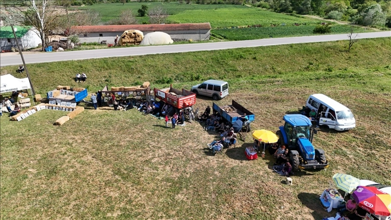 Oyunu izlemeye gelen köylüler, traktör römorklarını sahnenin etrafına dizerek, sahnelenen oyunu ilgiyle izledi.